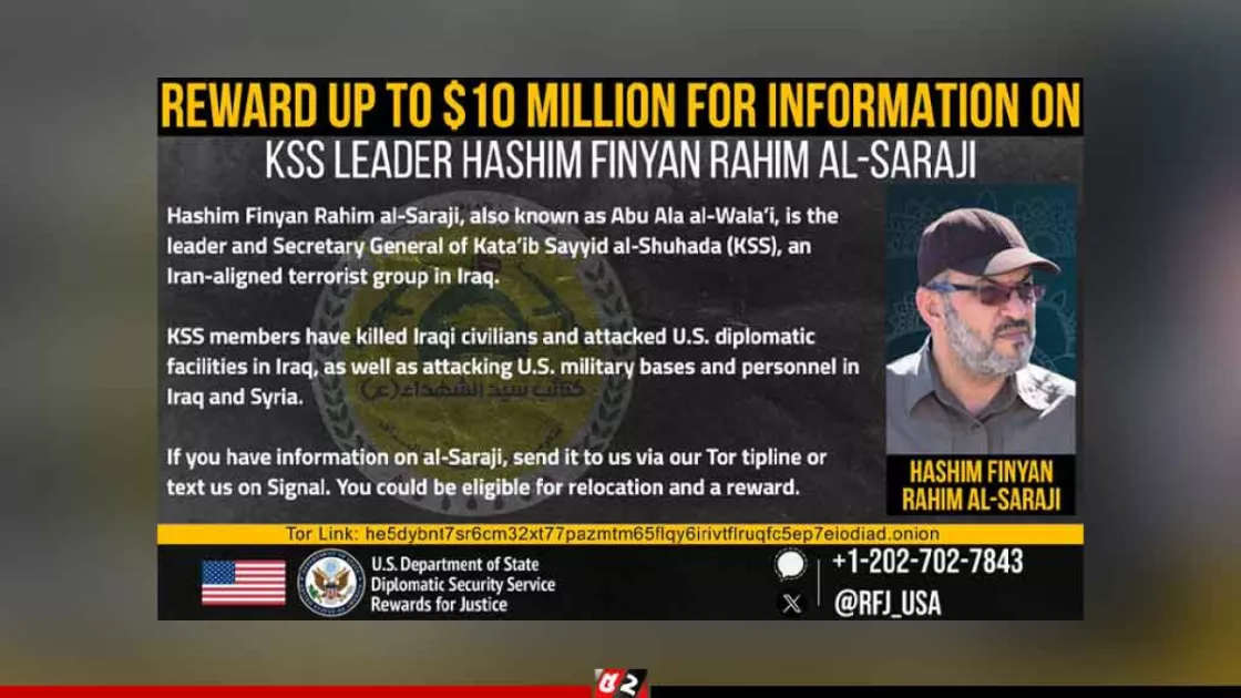 যুক্তরাষ্ট্রের পররাষ্ট্র দপ্তরের রিওয়ার্ডস ফর জাস্টিস প্রোগ্রাম-এর আওতায় এই ঘোষণা দেয়া হয়। এতে হাশিম ফিনিয়ান রহিম আল-সরাজির নাম উল্লেখ করা হয়েছে, যিনি ‘কাতায়িব সাইয়্যেদ আল-শুহাদা’ (কেএসএস) নামের একটি গোষ্ঠীর নেতৃত্ব দিচ্ছেন বলে দাবি ওয়াশিংটনের। যুক্তরাষ্ট্র এই সংগঠনটিকে সন্ত্রাসী গোষ্ঠী হিসেবে চিহ্নিত করেছে।