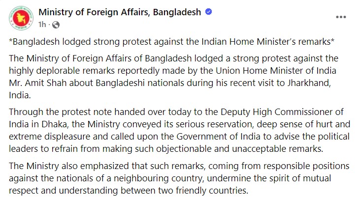 প্রতিবাদ নোটটি পররাষ্ট্র মন্ত্রণালয়ের ভেরিফাইড ফেসবুক পেজে প্রকাশ করা হয়েছে।