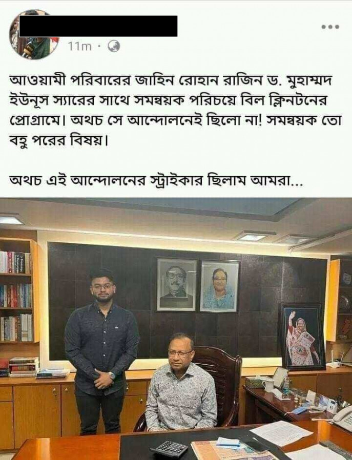 নিউইয়র্কে সাবেক মার্কিন প্রেসিডেন্ট বিল ক্লিনটন আয়োজিত 'ক্লিনটন গ্লোবাল ইনিশিয়েটিভ' অনুষ্ঠানে অন্তর্বর্তী সরকারের প্রধান উপদেষ্টা ড. মুহাম্মদ ইউনূসের পাশে থাকা এক তরুণকে নিয়ে চলছে আলোচনা। সামাজিক যোগাযোগ মাধ্যমে অনেকে তাকে ‘স্বৈরাচারী আওয়ামী লীগ’ সরকারের সংশ্লিষ্ট হিসেবে দাবি করেছেন। ছড়িয়ে পড়া একটি ছবিতে তাকে সদ্য পতন হওয়া আওয়ামী লীগ সরকারের স্থানীয় সরকার মন্ত্রী তাজুল ইসলামের সঙ্গে দেখা গেছে। ওই তরুণকে ‘অনুপ্রবেশকারী’ হিসেবে উল্লেখ করেছেন বৈষম্যবিরোধী আন্দোলনের সমন্বয়ক মাহফুজ আলম।