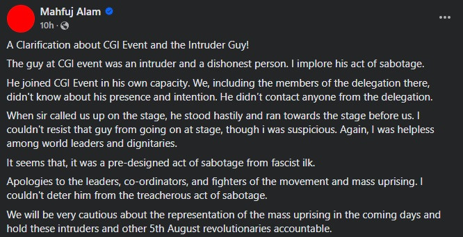 মাহফুজ আলম তার ফেসবুক পোস্টে লিখেছেন: "সিজিআই ইভেন্টের ওই ব্যক্তি ছিলেন একজন অনুপ্রবেশকারী এবং প্রতারণামূলক উদ্দেশ্যে সেখানে উপস্থিত হয়েছিলেন। আমি তার এই আচরণের তীব্র নিন্দা জানাই। তিনি নিজস্ব উদ্যোগে ইভেন্টে অংশ নেন এবং আমরা যারা প্রতিনিধি দলের সদস্য ছিলাম, তার উপস্থিতি কিংবা উদ্দেশ্য সম্পর্কে কিছুই জানতাম না। তিনি আমাদের কারো সাথেই যোগাযোগ করেননি। যখন স্যার আমাদের মঞ্চে ডাকেন, তিনি দ্রুত উঠে আমাদের আগেই মঞ্চের দিকে ছুটে যান। যদিও তার প্রতি সন্দেহ ছিল, আমি তাকে মঞ্চে উঠতে বাধা দিতে পারিনি। তবে বিশ্বনেতা ও বিশিষ্টজনদের মাঝে আমি অসহায় ছিলাম। মনে হচ্ছে, এটি ফ্যাসিস্ট গোষ্ঠীর পূর্বপরিকল্পিত ধ্বংসাত্মক কাজ ছিল। এই ঘটনার জন্য আমি আন্দোলনের নেতাকর্মী, সমন্বয়কারী এবং গণজাগরণের যোদ্ধাদের কাছে ক্ষমাপ্রার্থী। আমি তাকে প্রতিহত করতে পারিনি এবং তার এই বিশ্বাসঘাতকতার কাজ ঠেকাতে ব্যর্থ হয়েছি। আমরা ভবিষ্যতে গণজাগরণের প্রতিনিধিত্ব আরও সতর্কতার সাথে করবো এবং এই ধরনের অনুপ্রবেশকারী ও ৫ আগস্টের বিপ্লবের ষড়যন্ত্রকারীদের জবাবদিহির আওতায় আনব।"