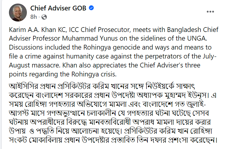 আন্তর্জাতিক অপরাধ আদালতের (আইসিসি) প্রধান কৌঁসুলি করিম খানের সঙ্গে বৈঠক করেছেন বাংলাদেশের অন্তর্বর্তী সরকারের প্রধান উপদেষ্টা ড. মুহাম্মদ ইউনূস। যুক্তরাষ্ট্রের নিউইয়র্কে জাতিসংঘের সাধারণ পরিষদের বার্ষিক অধিবেশনের ফাঁকে বৈঠকটি অনুষ্ঠিত হয়। শুক্রবার (২৭ সেপ্টেম্বর) বাংলাদেশের অন্তর্বর্তী সরকারের প্রধান উপদেষ্টার ভেরিফায়েড ফেসবুক পেজে দেওয়া পোস্টে এ তথ্য জানা যায়।