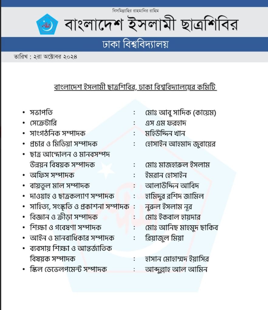 বাংলাদেশ ইসলামী ছাত্রশিবির ঢাকা বিশ্ববিদ্যালয় শাখার ১৪ সদস্যবিশিষ্ট পূর্ণাঙ্গ কমিটি ঘোষণা করা হয়েছে।