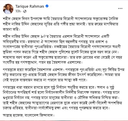তারেক রহমান বলেন, আমি স্বৈরাচার বিরোধী আন্দোলনের অকুতোভয় সৈনিক শহীদ নাজির উদ্দিন জেহাদের স্মৃতির প্রতি গভীর শ্রদ্ধা জানাই। তার রুহের মাগফিরাত কামনা করি।