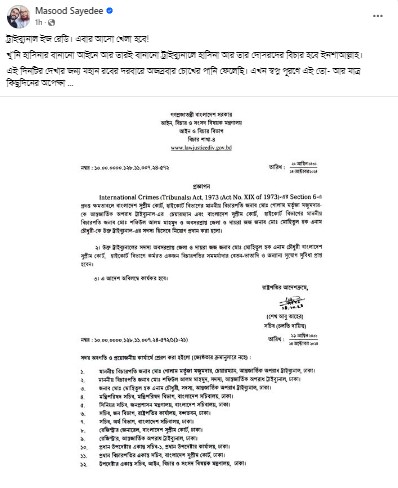 নিজের ব্যক্তিগত ফেসবুক আইডিতে দেয়া পোস্টে সাঈদীপুত্র আন্তর্জাতিক অপরাধ ট্রাইব্যুনাল পুনর্গঠনের একটি প্রজ্ঞাপন দিয়েছেন। ক্যাপশনে লিখেছেন, ট্রাইব্যুনাল ইজ রেডি। এবার আসো খেলা হবে।