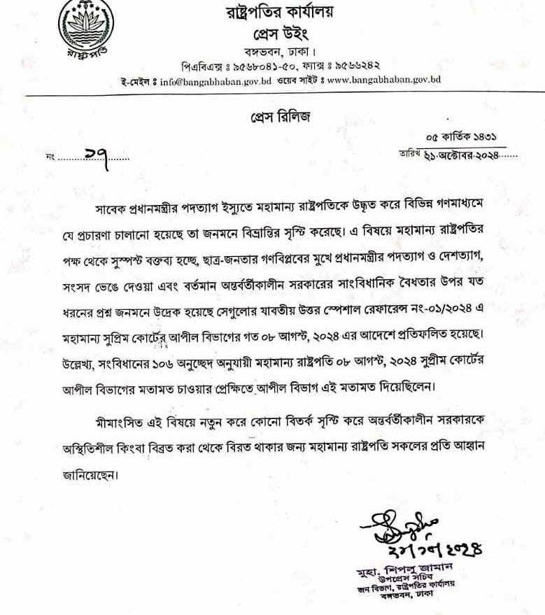 এতে বলা হয়, সাবেক প্রধানমন্ত্রীর পদত্যাগ ইস্যুতে রাষ্ট্রপতিকে উদ্ধৃত করে বিভিন্ন মিডিয়ায় যে প্রচারণা চালানো হয়েছে তা জনমনে বিভ্রান্তির সৃষ্টি করেছে। এ বিষয়ে রাষ্ট্রপতির পক্ষ থেকে সুস্পস্ট বক্তব্য হচ্ছে, ছাত্র-জনতার গণবিপ্লবের মুখে প্রধানমন্ত্রীর পদত্যাগ ও দেশত্যাগ, সংসদ ভেঙে দেয়া এবং বর্তমান অন্তর্বর্তী সরকারের সাংবিধানিক বৈধতার উপর যত ধরনের প্রশ্ন জনমনে উদ্রেক হয়েছে সেগুলোর যাবতীয় উত্তর স্পেশাল রেফারেন্স নং-০১/২০২৪ এ সুপ্রিম কোর্টের আপিল বিভাগের গত ৮ আগস্ট, ২০২৪ এর আদেশে প্রতিফলিত হয়েছে।