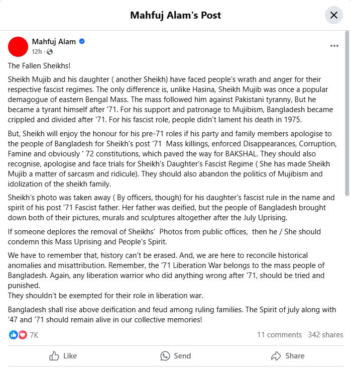কেউ যদি সরকারি অফিস থেকে শেখদের (শেখ মুজিবুর রমহান ও শেখ হাসিনা) ছবি সরানোর কারণে আক্ষেপ প্রকাশ করেন, তবে তিনি এ গণ-অভ্যুত্থান ও গণমানুষের চেতনারই নিন্দা জানালেন। শেখ হাসিনার ফ্যাসিবাদী শাসনের কথা শেখ মুজিবুর রহমানের দল ও পরিবারের সদস্যদের স্বীকার করা, ক্ষমা চাওয়া এবং এ জন্য বিচারের মুখোমুখি হওয়া উচিত বলে মন্তব্য করেছেন অন্তর্বর্তী সরকারের উপদেষ্টা মাহফুজ আলম।