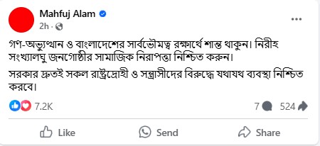 গণ-অভ্যুত্থান ও বাংলাদেশের সার্বভৌমত্ব রক্ষার্থে শান্ত থাকুন। নিরীহ সংখ্যালঘু জনগোষ্ঠীর সামাজিক নিরাপত্তা নিশ্চিত করতে সকলের প্রতি আহ্বান জানিয়েছেন বৈষম্যবিরোধী ছাত্র আন্দোলনের নেতা ও অন্তর্বর্তী সরকারের উপদেষ্টা মাহফুজ আলম।