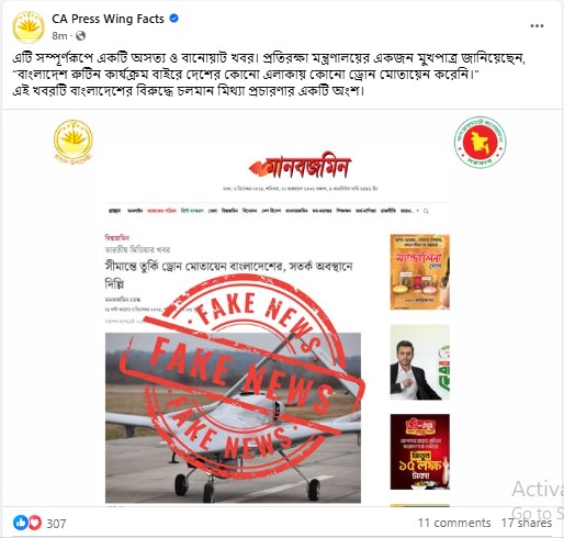 প্রেস উইং জানায়, এটি সম্পূর্ণরূপে একটি অসত্য ও বানোয়াট খবর। প্রতিরক্ষা মন্ত্রণালয়ের একজন মুখপাত্র জানিয়েছেন, "বাংলাদেশ রুটিন কার্যক্রম বাইরে দেশের কোনো এলাকায় কোনো ড্রোন মোতায়েন করেনি।"