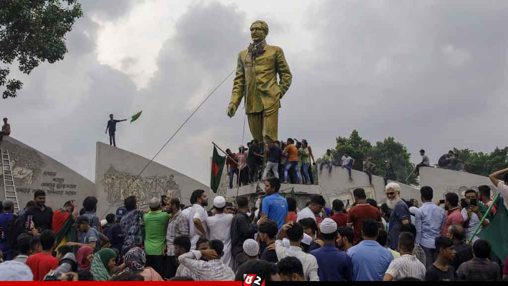 একই দিনে রাজধানীর বিজয় স্মরণী মোড়ে স্থাপিত দেশের ইতিহাসের একটি গুরুত্বপূর্ণ প্রতীক শেখ মুজিবুর রহমানের প্রতিৃকৃতি ভেঙে দেয় বিক্ষুব্ধরা।