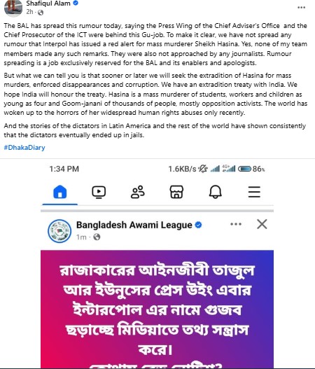 অন্তর্বর্তী সরকারের প্রধান উপদেষ্টার প্রেস সচিব শফিকুল আলম জানিয়েছেন, আমরা কোনো গুজব ছড়াইনি যে ইন্টারপোল গণহত্যাকারী শেখ হাসিনার বিরুদ্ধে রেড অ্যালার্ট জারি করেছে। আমার দলের কেউই এ ধরনের কোনো মন্তব্য করেনি। তাদের সঙ্গে কোনো সাংবাদিক যোগাযোগ করেননি। গুজব ছড়ানো একমাত্র বাংলাদেশ আওয়ামী লীগ ও তাদের সহযোগী ও সমর্থকদের কাজ।