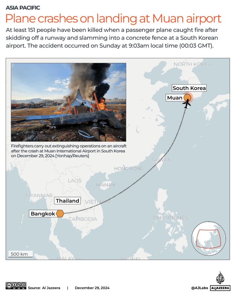 আল জাজিরার প্রতিবেদনে হয়, রোববার স্থানীয় সময় সকাল ৯টা ৩০ মিনিটে জিজু এয়ারলাইন্সের বিমানটি ব্যাংকক থেকে মুয়ান আন্তর্জাতিক বিমানবন্দরে অবতরণ করার সময় রানওয়ে থেকে ছিটকে যায়। পরে এতে আগুন ধরে গেলে অনেক যাত্রী মারা যান।
