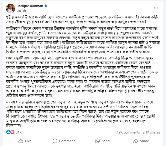 বিএনপির ভারপ্রাপ্ত চেয়ারম্যান আরও লিখেছেন, অতীতের অভিজ্ঞতাকে কাজে লাগিয়ে আসুন আমরা রাষ্ট্র ও সমাজে সাম্য, মানবিক মর্যাদা ও ন্যায়বিচার প্রতিষ্ঠার সংগ্রামে একযোগে কাজ করি। আমরা এমন একটি জাতি নির্মাণের প্রত্যাশা করছি, যেখানে প্রত্যেকটি নাগরিকই গুরুত্বপূর্ণ এবং প্রত্যেকের কণ্ঠ স্বাধীন থাকবে।এ বৎসরের বেশ কিছু তিক্ত অভিজ্ঞতা, ছাত্র-জনতার আত্মদান এবং অধিকার হারানোর যন্ত্রণা আগামী বৎসরে আমাদের একদিকে যেমন বেদনার্ত করবে আবার অন্যদিকে নতুন উদ্যমে শান্তি, সম্প্রীতি ও বহুদলীয় গণতন্ত্রের অধিকার ফিরে পাওয়ার সম্ভাবনায় আমাদেরকে উদ্বুদ্ধ করবে।