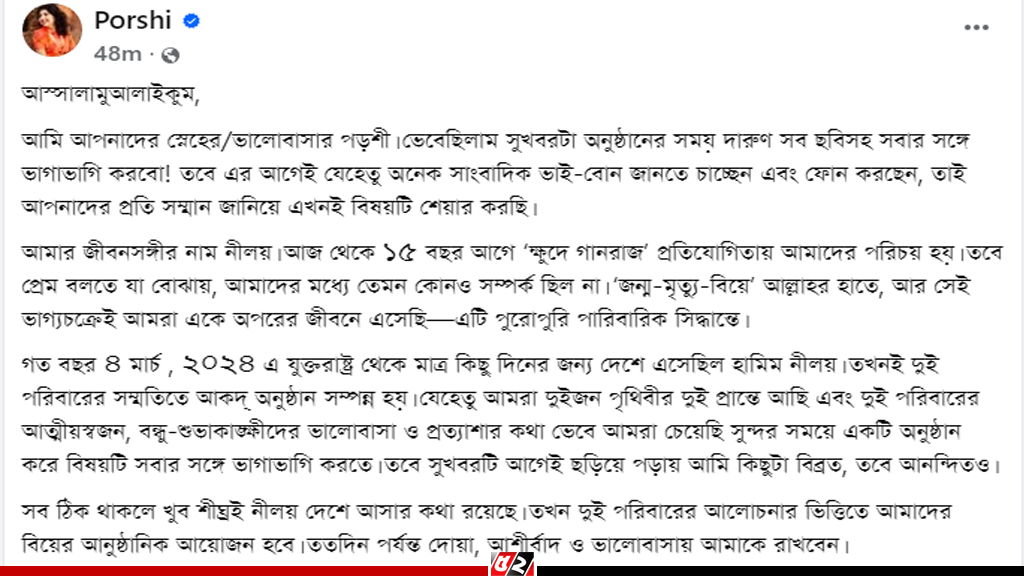 আমি আপনাদের স্নেহের/ভালোবাসার পড়শী। ভেবেছিলাম সুখবরটা অনুষ্ঠানের সময় দারুণ সব ছবিসহ সবার সঙ্গে ভাগাভাগি করবো! তবে এর আগেই যেহেতু অনেক সাংবাদিক ভাই-বোন জানতে চাচ্ছেন এবং ফোন করছেন, তাই আপনাদের প্রতি সম্মান জানিয়ে এখনই বিষয়টি শেয়ার করছি।