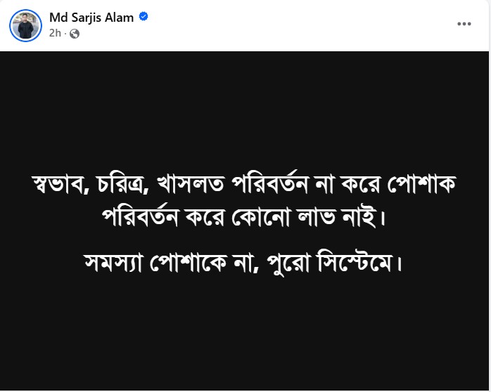 তিনি লেখেন, ‘স্বভাব, চরিত্র, খাসলত পরিবর্তন না করে পোশাক পরিবর্তনে কোনো লাভ হবে না। সমস্যা পোশাকে নয়, পুরো সিস্টেমেই।’
