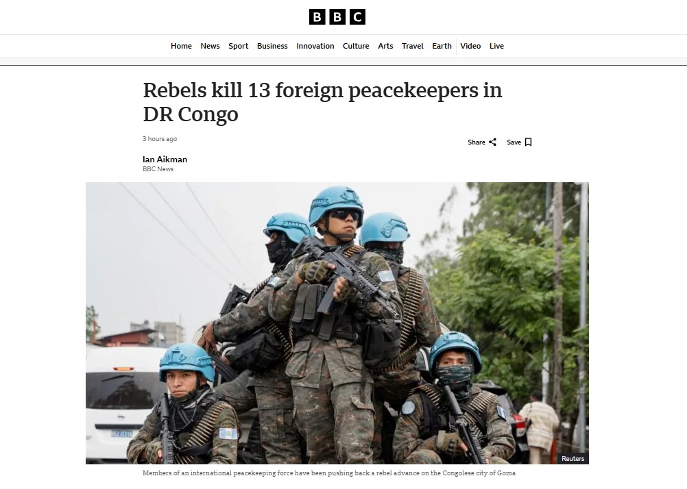 ডেমোক্র্যাটিক রিপাবলিক অব কঙ্গোতে (ডিআর কঙ্গো) জাতিসংঘের ১৩ জন বিদেশি শান্তিরক্ষী নিহত হয়েছেন। এই হতাহতের ঘটনা ঘটেছে বিদ্রোহী এম২৩ গোষ্ঠীর সঙ্গে সংঘর্ষে। নিহতদের মধ্যে নয়জন দক্ষিণ আফ্রিকার, তিনজন মালাউইয়ের এবং একজন উরুগুয়ের সৈন্য। সর্বশেষ খবর অনুযায়ী সৌভাগ্যক্রমে এখানে কোন বাংলাদেশী সেনা নিহত হননি।