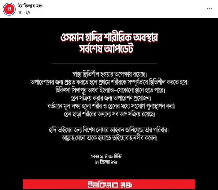 বুধবার (১৭ ডিসেম্বর) দুপুরে সংগঠনের ফেসবুক পেজে প্রকাশিত এক পোস্টে হাদির বর্তমান স্বাস্থ্য পরিস্থিতি তুলে ধরা হয়।