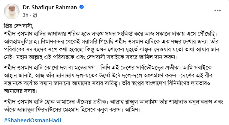 এক ফেসবুক পোস্টে জামায়াত আমির লিখেছেন, শহীদ ওসমান হাদির জানাজায় শরিক হতে লন্ডন সফর সংক্ষিপ্ত করে আজ সকালে ঢাকায় এসে পৌঁছেছি। আলহামদুলিল্লাহ। বিমানবন্দর থেকেই সরাসরি গিয়েছি শহীদ ওসমান হাদিকে এক নজর দেখার জন্য। তার পরিবারের সদস্যদের সঙ্গে কথা হয়েছে; কিন্তু এমন শোকের মুহূর্তে সান্ত্বনা দেওয়ার মতো ভাষা আমার জানা নেই। মহান আল্লাহ এই পরিবারকে এবং দেশবাসী সবাইকে সবরে জামিল দান করুন।