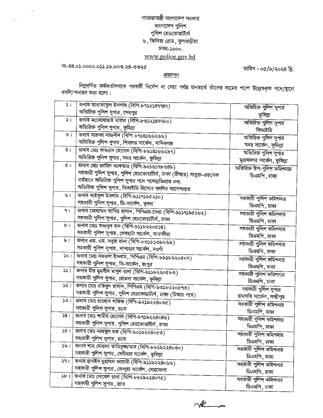 বাংলাদেশ পুলিশের অতিরিক্ত পুলিশ সুপার ও সহকারি পুলিশ সুপার পদমর্যাদার ৩৩ জন কর্মকর্তাকে বিভিন্ন ইউনিটে পদায়ন করা হয়েছে।
