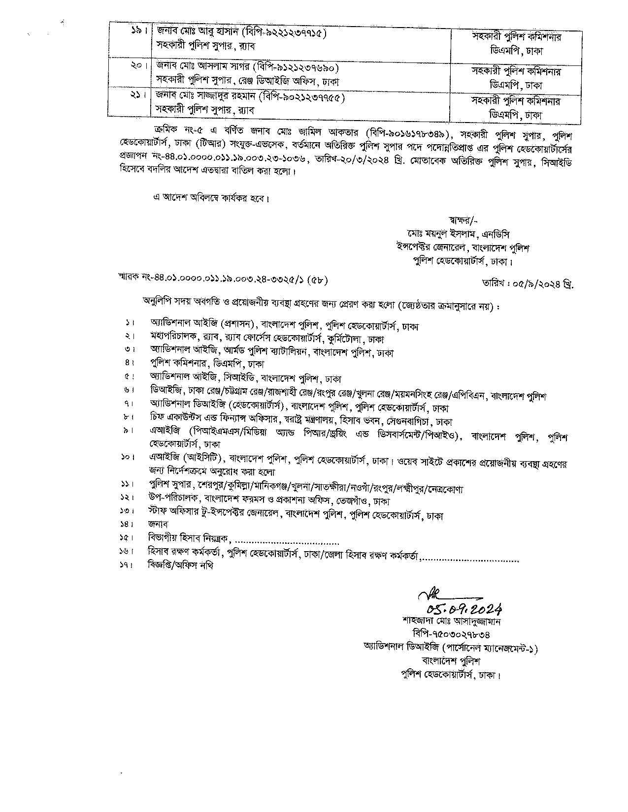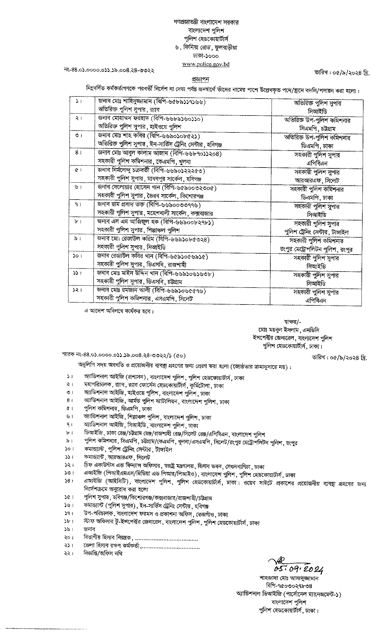 বৃহস্পতিবার (৫ সেপ্টেম্বর) পুলিশ মহাপরিদর্শক (আইজিপি) মো. ময়নুল ইসলামের সই করা পৃথক দুই প্রজ্ঞাপনে এই পদায়ন করা হয়।