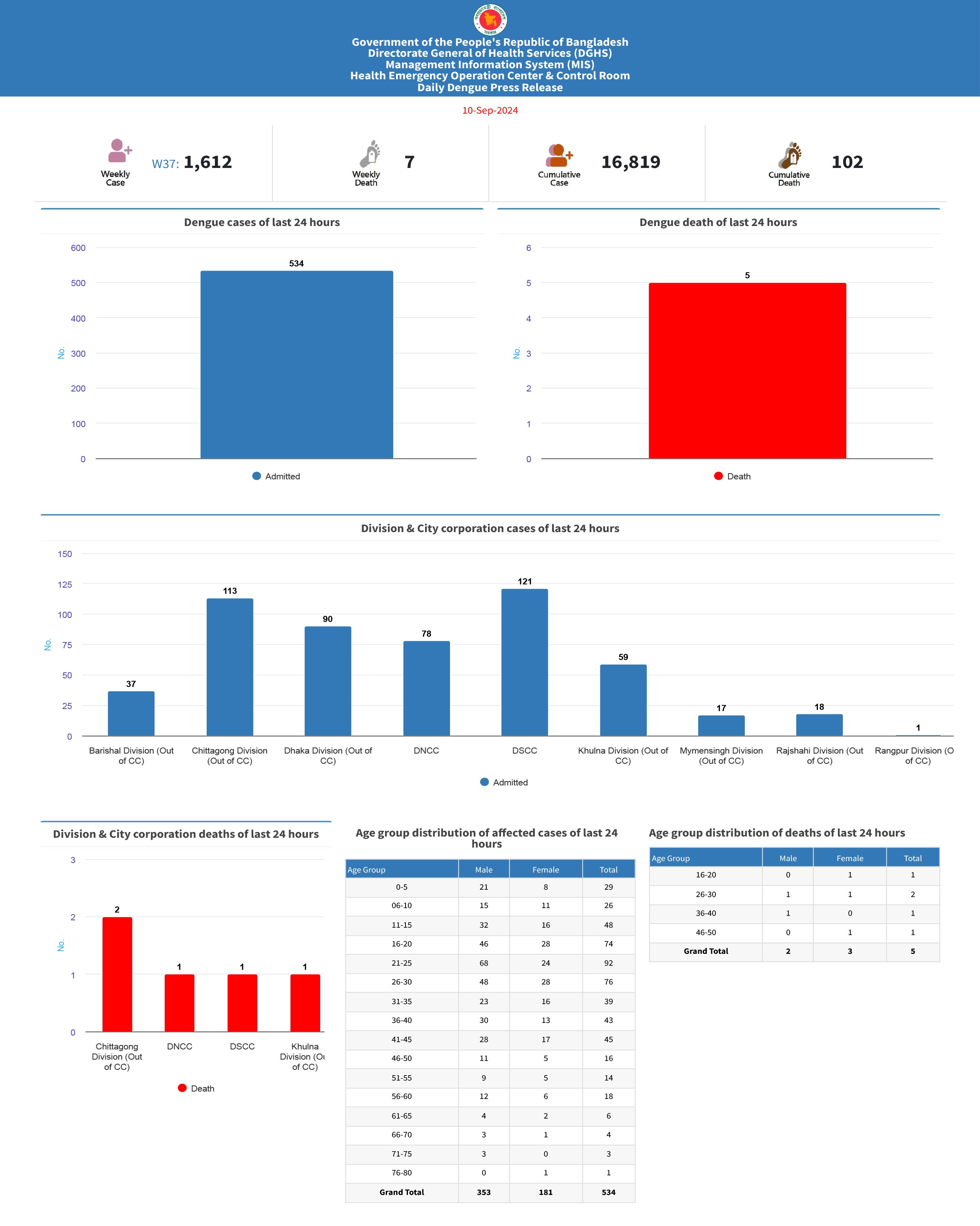 মঙ্গলবার (১০ সেপ্টেম্বর) স্বাস্থ্য অধিদপ্তরের হেলথ ইমার্জেন্সি অপারেশন সেন্টার ও কন্ট্রোল রুম থেকে প্রাপ্ত সংবাদ বিজ্ঞপ্তিতে এ তথ্য জানা যায়।