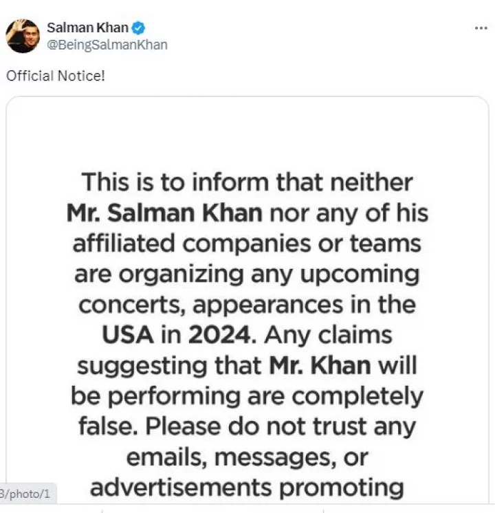 সালমান খান সামাজিক যোগাযোগ মাধ্যম এক্স-এ পোস্ট করে লেখেন, ‘আমি আপনাদের জানাতে চাই যে সালমান খান অথবা তাঁর কোন সংশ্লিষ্ট প্রতিষ্ঠান ২০২৪ সালে যুক্তরাষ্ট্রে কোনো কনসার্ট বা অনুষ্ঠান আয়োজন করছে না। যদি কেউ দাবি করেন যে সালমান খান পারফরম্যান্স করবেন তা সম্পূর্ণ মিথ্যা। এসব ইমেইল, বার্তা, বা বিজ্ঞাপন বিশ্বাস করবেন না। প্রতারণামূলকভাবে নাম ব্যবহার করার অভিযোগে আইনগত ব্যবস্থা নেওয়া হবে।’
