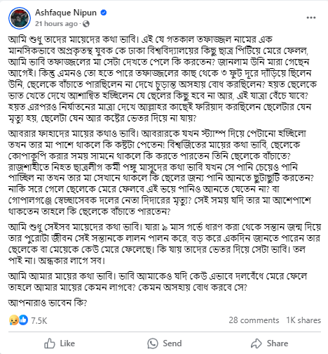 পোস্টে আশফাক নিপুন লিখেছেন, ‘আমি শুধু তাদের মায়েদের কথা ভাবি। এই যে গতকাল তফাজ্জল নামের এক মানসিকভাবে অপ্রকৃতিস্থ যুবক কে ঢাকা বিশ্ববিদ্যালয়ের কিছু ছাত্র পিটিয়ে মেরে ফেলল, আমি ভাবি তফাজ্জলের মা সেটা দেখতে পেলে কি করতেন জানলাম উনি মারা গেছেন আগেই। কিন্তু এমনও তো হতে পারে তফাজ্জলের কাছ থেকে ৩ ফুট দূরে দাঁড়িয়ে ছিলেন উনি, ছেলেকে বাঁচাতে পারছিলেন না দেখে চূড়ান্ত অসহায় বোধ করছিলেন’
