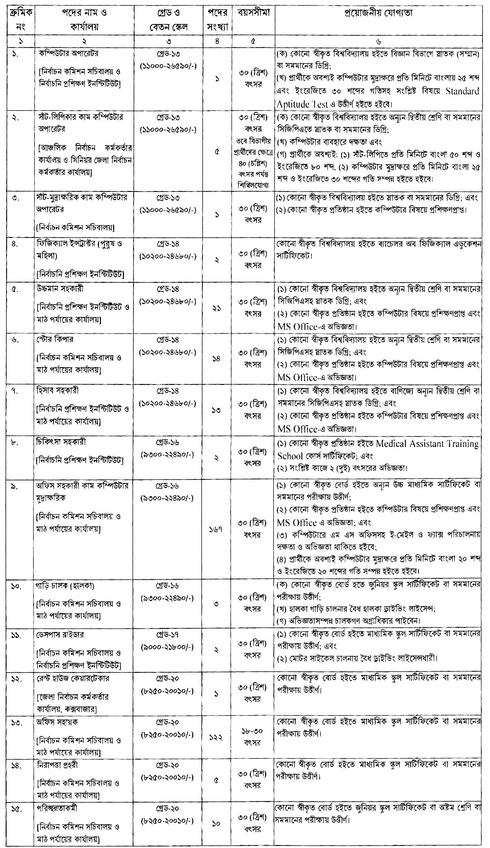 বাংলাদেশ নিবার্চন কমিশন রাজস্ব খাতে লোকবল নিয়োগ দেবে। প্রতিষ্ঠানটির সচিবালয় ও এর অধীনে মাঠপর্যায়ের কার্যালয়ে ১৫টি পদে ৩৬৯ জনকে নিয়োগ দেবে। আগ্রহী প্রার্থীরা অনলাইনে আবেদন করতে পারবেন। আবেদনের শেষ সময় আগামী ৩১ অক্টোবর।