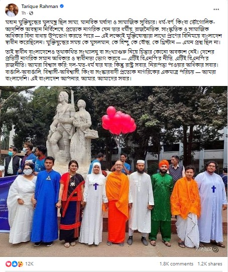 তিনি আরও বলেন, "তাই স্বাধীন বাংলাদেশেও তথাকথিত সংখ্যালঘু বা সংখ্যাগুরু নিয়ে চিন্তার কোনো অবকাশ নেই। দেশের প্রতিটি নাগরিক সমান অধিকার ও স্বাধীনতা ভোগ করবে — এটিই বিএনপি’র নীতি, এটিই বিএনপি’র রাজনীতি। আমরা বিশ্বাস করি; দল-মত-ধর্ম যার যার; কিন্তু রাষ্ট্র সবার, নিরাপত্তা পাওয়ার অধিকার সবার। বাঙালি-অবাঙালি, বিশ্বাসী-অবিশ্বাসী, কিংবা সংস্কারবাদী প্রত্যেক নাগরিকের একমাত্র পরিচয় — আমরা বাংলাদেশি। এই বাংলাদেশ আপনার, আমার, আমাদের সবার"।