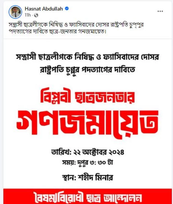 পোস্টের ক্যাপশনে হাসনাত লিখেছেন, ‘সন্ত্রাসী ছাত্রলীগকে নিষিদ্ধ ও ফ্যাসিবাদের দোসর রাষ্ট্রপতি চুপ্পুর পদত্যাগের দাবিতে ছাত্র-জনতার গনজমায়েত।’