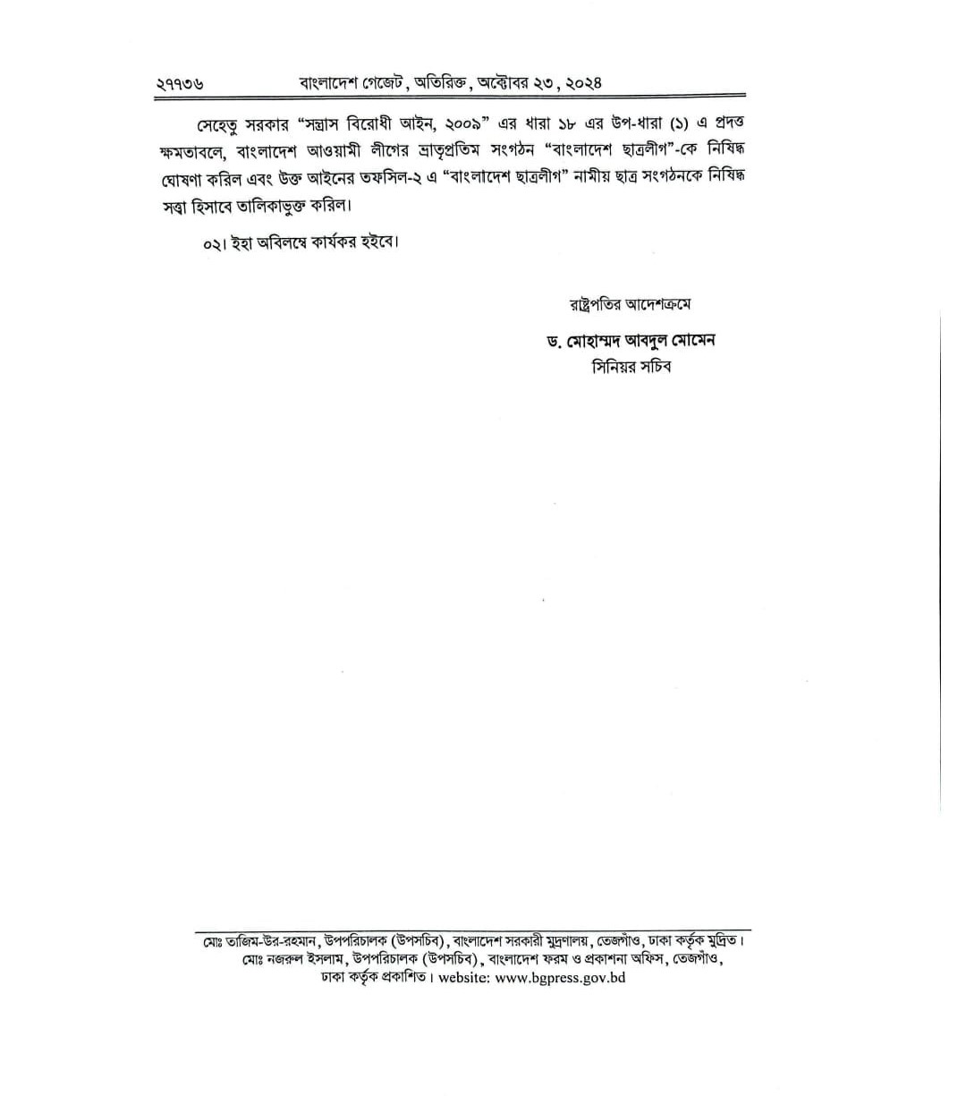 এই অবস্থায় সরকার 'সন্ত্রাস বিরোধী আইন, ২০০৯' এর ধারা ১৮ এর উপ-ধারা (১) এ প্রদত্ত ক্ষমতাবলে বাংলাদেশ আওয়ামী লীগের ভ্রাতৃপ্রতিম সংগঠন 'বাংলাদেশ ছাত্রলীগ'কে নিষিদ্ধ ঘোষণা করলো এবং ওই আইনের তফসিল-২ এ 'বাংলাদেশ ছাত্রলীগ' নামীয় ছাত্র সংগঠনকে নিষিদ্ধ সত্ত্বা হিসেবে তালিকাভুক্ত করলো।