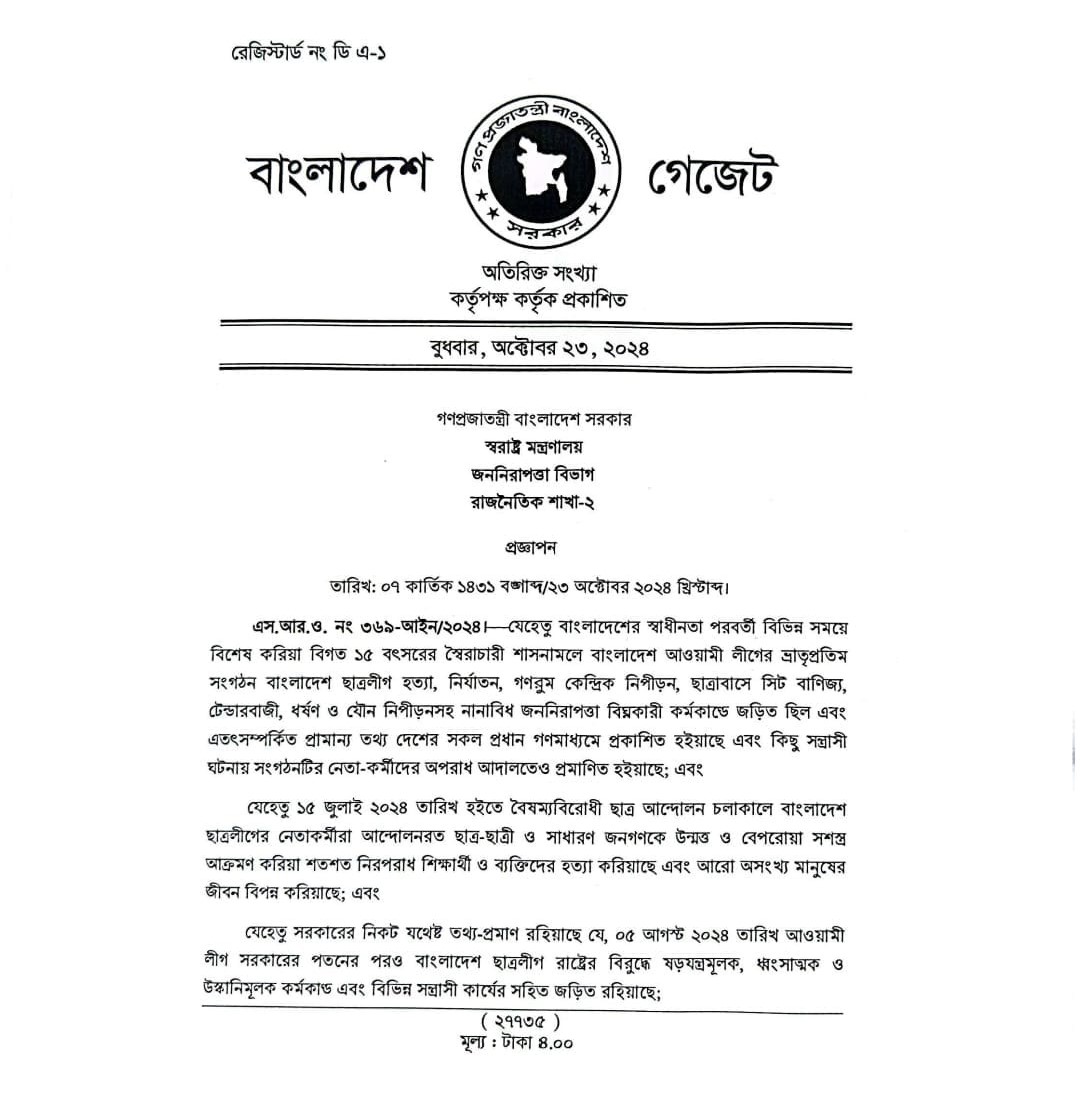 সরকারের কাছে যথেষ্ট তথ্য-প্রমাণ রয়েছে যে, গত ৫ আগস্ট আওয়ামী লীগ সরকারের পতনের পরও বাংলাদেশ ছাত্রলীগ রাষ্ট্রের বিরুদ্ধে ষড়যন্ত্রমূলক, ধ্বংসাত্মক ও উসকানিমূলক কর্মকাণ্ড এবং বিভিন্ন সন্ত্রাসী কাজে জড়িত আছে।