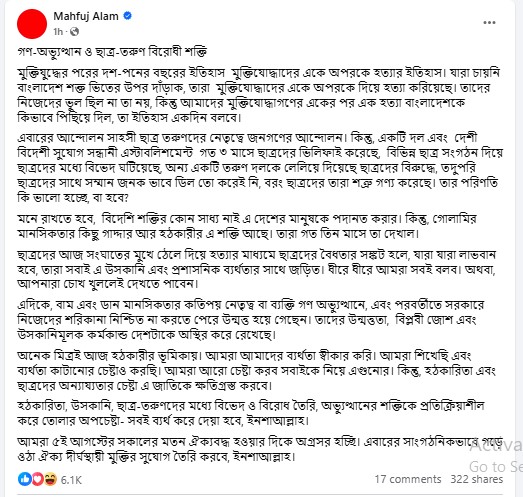 তিনি আরও বলেন, এবারের আন্দোলন সাহসী ছাত্র-তরুণদের নেতৃত্বে জনগণের আন্দোলন। কিন্তু, একটি দল এবং দেশি-বিদেশি সুযোগসন্ধানী এস্টাবলিশমেন্ট গত ৩ মাসে ছাত্রদের ভিলিফাই করেছে, বিভিন্ন ছাত্র সংগঠন দিয়ে ছাত্রদের মধ্যে বিভেদ ঘটিয়েছে, অন্য একটি তরুণ দলকে লেলিয়ে দিয়েছে ছাত্রদের বিরুদ্ধে, তদুপরি ছাত্রদের সঙ্গে সম্মানজনকভাবে ডিল তো করেইনি, বরং ছাত্রদের তারা শত্রু গণ্য করেছে।