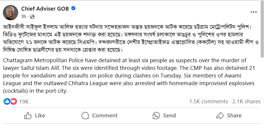 ফেসবুক পোস্টে বলা হয়েছে, হত্যার ঘটনায় সন্দেহভাজন অন্তত ছয়জনকে আটক করেছে চট্টগ্রাম মেট্রোপলিটন পুলিশ (সিএমপি)। ভিডিও ফুটেজের মাধ্যমে এই ছয়জনকে শনাক্ত করা হয়েছে। মঙ্গলবার সংঘর্ষ চলাকালে ভাঙচুর ও পুলিশের ওপর হামলার অভিযোগে ২১ জনকে আটক করেছে সিএমপি। বন্দরনগরে ককটেলসহ আওয়ামী লীগ ও নিষিদ্ধ ঘোষিত ছাত্রলীগের ছয় সদস্যকে গ্রেপ্তার করা হয়েছে।