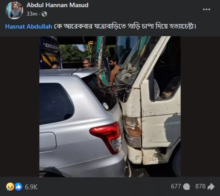 বৈষম্যবিরোধী ছাত্র আন্দোলনের আহ্বায়ক হাসনাত আব্দুল্লাহকে আবারও গাড়িচাপা দিয়ে হত্যাচেষ্টা করা হয়েছে বলে অভিযোগ উঠেছে।