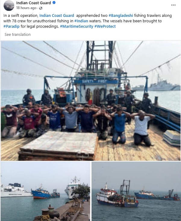 ছবির ক্যাপশনে ভারতীয় কোস্ট গার্ড জানিয়েছে, ভারতীয় সমুদ্রসীমায় মৎস্য আহরণের অভিযোগে এক অভিযানে ট্রলার ২টিসহ ৭৮ নাবিককে আটক করা হয়েছে। নাবিকসহ ট্রলার দুটি প্যারা দ্বীপের কাছে নেয়া হয়েছে।