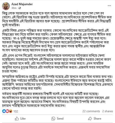পোস্টে উপ প্রেস সচিব বলেন, 'একটা বিষয় এখানে পরিষ্কার করা দরকার, কোনো সাংবাদিকের অ্যাক্রেডিটেশন কার্ড এই সিদ্ধান্তের মধ্য দিয়ে বাতিল করা হয়নি। কেবল সচিবালয়ের ক্ষেত্রে এর ব্যবহার সীমিত করা হয়েছে। তা-ও খুবই অল্প সময়ের জন্য। প্রয়োজনীয় ক্ষেত্রে অস্থায়ী পাশ ইস্যু করা হবে। সরকার সিদ্ধান্ত নিয়েছে শীঘ্রই বিদ্যমান সব প্রেস অ্যাক্রেডিটেশন কার্ডই পর্যালোচনা করা হবে এবং নতুন অ্যাক্রেডিটেশন কার্ড ইস্যু করার জন্য সমস্ত স্থানীয় এবং আন্তর্জাতিক সংবাদ মাধ্যমের কাছে আবেদন চাওয়া হবে'।