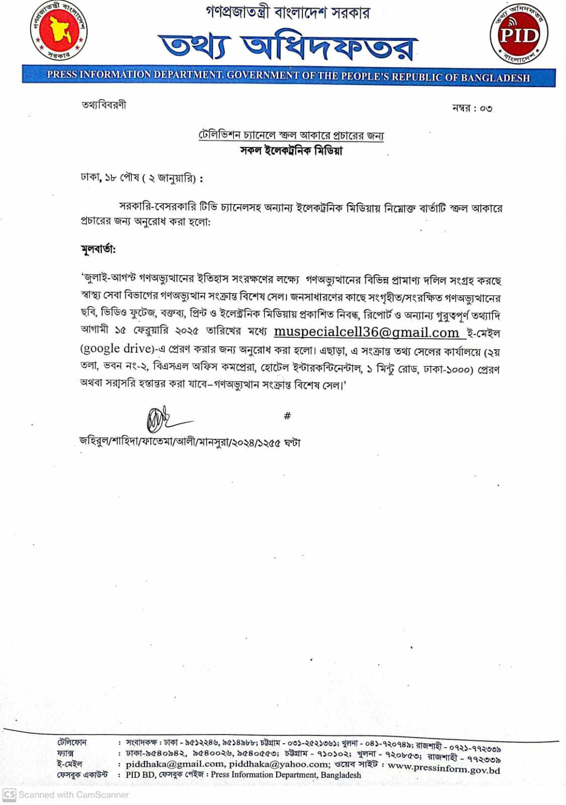 বিজ্ঞপ্তিতে বলা হয়েছে, জনসাধারণের কাছে সংগৃহীত/সংরক্ষিত গণঅভ্যুত্থানকালীন ধারণকৃত স্থিরচিত্র, ভিডিও ফুটেজ, ডকুমেন্টারি ও অন্যান্য গুরুত্বপূর্ণ তথ্যাদি আগামী ১৫ ফেব্রুয়ারির মধ্যে গণঅভ্যুত্থান সংক্রান্ত বিশেষ সেলের গুগল ড্রাইভে (muspecialcell36@gmail.com) আপলোড করার জন্য অনুরোধ করা হলো। এছাড়াও এসকল তথ্য (স্থিরচিত্র, ভিডিও ফুটেজ ও ডকুমেন্টারি) বর্ণিত সময়ের মধ্যে গণঅভ্যুত্থান সংক্রান্ত বিশেষ সেলের কার্যালয়ে (২য় তলা, ভবন নং-২, বিএসএল অফিস কমপ্লেক্স, হোটেল ইন্টারকন্টিনেন্টাল, ১ মিন্টু রোড, ঢাকা-১০০০) পেনড্রাইভ যোগে প্রেরণ অথবা সরাসরি হস্তান্তর করা যাবে।