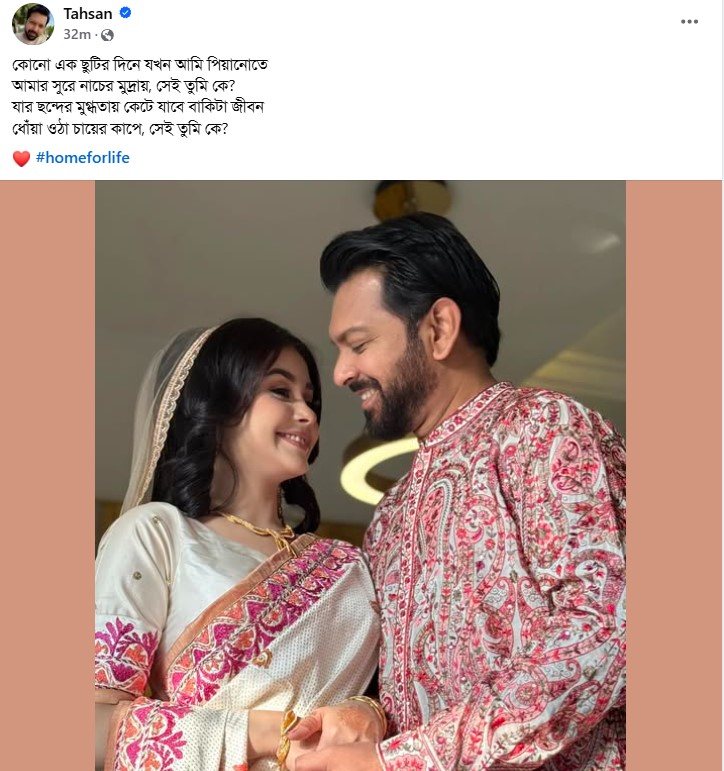 ছবিটি শেয়ার করে তাহসান লেখেন, "কোনো এক ছুটির দিনে যখন আমি পিয়ানোতে আমার সুরে নাচের মুদ্রায়, সেই তুমি কে? যার ছন্দের মুগ্ধতায় কেটে যাবে বাকিটা জীবন ধোঁয়া ওঠা চায়ের কাপে, সেই তুমি কে?"