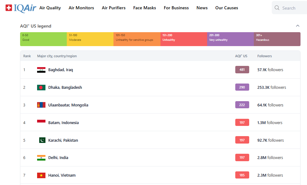 বিশ্বের দূষিত বায়ুর শহরের তালিকার দ্বিতীয় স্থানে আছে ঢাকা, স্কোর ২৯০। এতে ঢাকার বাতাস ‘খুবই অস্বাস্থ্যকর’ হিসেবে ধরা হচ্ছে। তালিকার শীর্ষস্থানে আছে ইরাকের বাগদাদ, স্কোর ৪৮১।