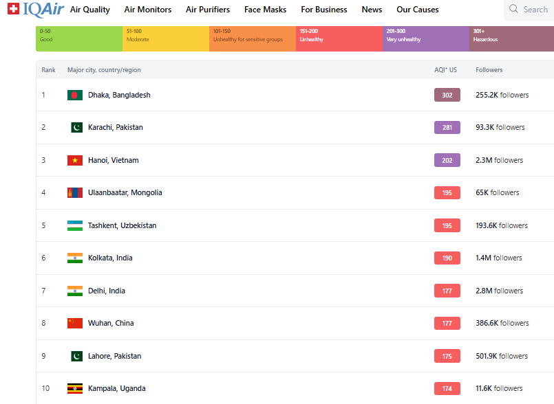 বিশ্বে বায়ুদূষনে ঢাকা এখন শীর্ষ অবস্থানে রয়েছে। বাতাসের মান সূচকে ঢাকার বাতাসের স্কোর ৩০২। যা দুর্যোগপূর্ণ বা ঝুঁকিপূর্ণ। মূলত ৩০১ থেকে এই মান শুরু হয়।