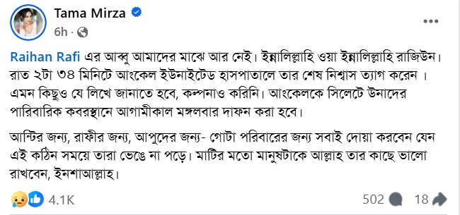 তিনি লিখেছেন, "রায়হান রাফির আব্বু আমাদের মাঝে আর নেই। ইন্না লিল্লাহি ওয়া ইন্না ইলাইহি রাজিউন। রাত ২টা ৩৪ মিনিটে আংকেল ইউনাইটেড হাসপাতালে মারা গেছেন।"