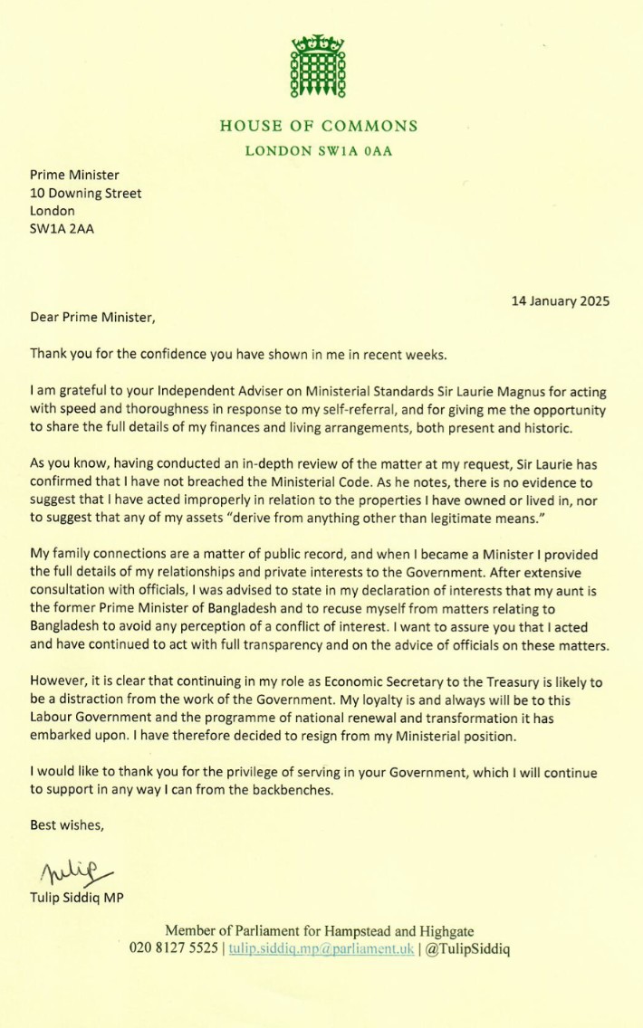টিউলিপি সিদ্দিকের পদত্যাগ পত্র গ্রহণ করেছেন ব্রিটিশ প্রধানমন্ত্রী স্যার কিয়ার স্টারমার।