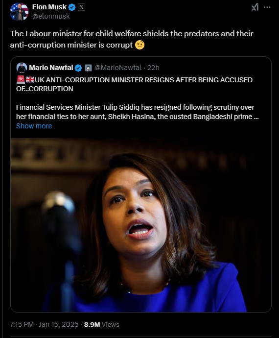 ইলন মাস্ক তার মন্তব্যে আরও বলেন, “শিশুকল্যাণের দায়িত্বে থাকা লেবার মন্ত্রী এমন কিছু লোককে রক্ষা করেছেন, যারা নির্দয়ভাবে মানুষকে শোষণ করেছে। তাদের (লেবার পার্টির) দুর্নীতিবিরোধী মন্ত্রী নিজেই দুর্নীতিবাজ।”