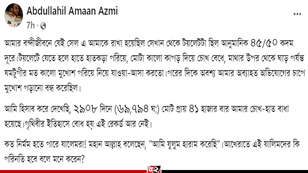 বাংলাদেশ সেনাবাহিনীর ব্রিগেডিয়ার জেনারেল (অব.) আব্দুল্লাহিল আমান আযমী জানিয়েছেন, তাকে টয়লেটে নিতেও যম টুপি পড়ানো হতো। বাঁধা হতো চোখ-হাত। দীর্ঘ ৮ বছরে ২ হাজার ৯০৮ দিনে মোট প্রায় ৪১ হাজার বার তার চোখ-হাত বাঁধা হয়েছে তার।