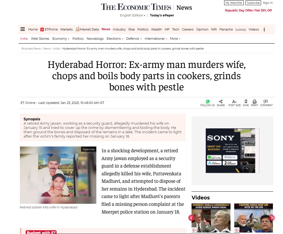 দ্য ইকোনোমিক টাইমস জানিয়েছে, গত ১৬ জানুয়ারি পুত্তভেনকাটা মাধবী (৩৫) নিখোঁজ হয়েছেন বলে মিরপেট থানায় রিপোর্ট করেন তার বাবা-মা। এরপরেই পুলিশ তদন্ত শুরু করলে তাদের সন্দেহ হয় ভেনকাটার স্বামী গুরুর প্রতি। পুলিশ তাকে জিজ্ঞাসা শুরু করলে গুরুমূর্তি প্রথমে দাবি করেন, তর্কাতর্কির পর মাধবী আত্মীয়ের বাড়ি যাওয়ার কথা বলে বাড়ি ছেড়ে চলে গেছেন। তবে পুলিশের তীক্ষ্ণ জিজ্ঞাসাবাদের মুখে তিনি স্বীকার করেন, ১৫ জানুয়ারি রাগের মাথায় তিনি তার স্ত্রীকে খুন করেছেন।