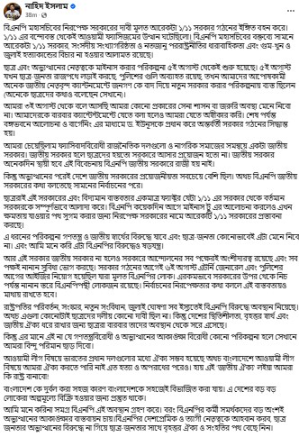 ‘ছাত্ররাই এই সরকারের এবং বিদ্যমান বাস্তবতার একমাত্র ফ্যাক্টর যেটা ১/১১ এর সরকার থেকে বর্তমান সরকারকে সম্পূর্ণভাবে আলাদা করে। বিএনপি কয়েকদিন আগে মাইনাস টু এর আলোচনা করলেও এখন ক্ষমতায় যাওয়ার পথ সুগম করার জন্য নিরপেক্ষ সরকারের নামে আরেকটি ১/১১ সরকারের প্রস্তাবনা করছে।