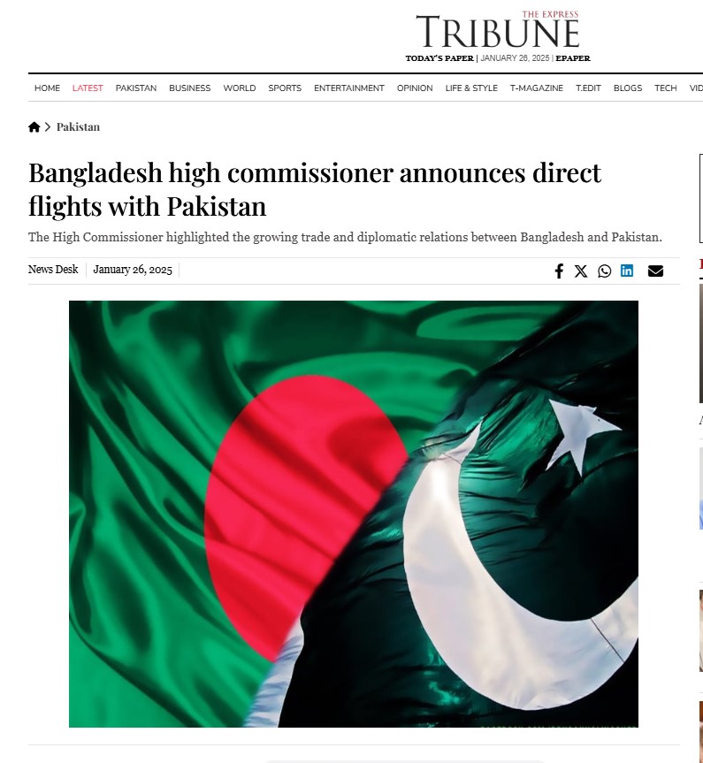 প্রতিবেদনে বলা হয়েছে, পাকিস্তানে নিযুক্ত বাংলাদেশের হাইকমিশনার মোহাম্মদ ইকবাল হুসেইন দ্বিপাক্ষিক সম্পর্ক আরও জোরদার করে বাংলাদেশ ও পাকিস্তানের মধ্যে সরাসরি বিমান পরিষেবা চালু করার পরিকল্পনা ঘোষণা করেছেন।