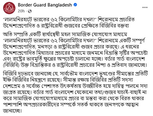সম্প্রতি ‘লালমনিরহাটে ভারতের ৬২ কিলোমিটার দখল?’ শিরোনামে একটি স্বার্থান্বেষী মহল সামাজিক যোগাযোগ মাধ্যমে সংবাদ প্রচার করেছে। বিষয়টি সম্পূর্ণ উদ্দেশ্যপ্রণোদিত, মনগড়া ও রাষ্ট্রবিরোধী গুজব বলে জানিয়েছে বর্ডার গার্ড বাংলাদেশ (বিজিবি)।
