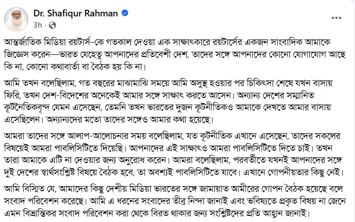 বৃহস্পতিবার (১ জানুয়ারি) সকাল সাড়ে ৯টায় নিজের ভেরিফায়েড ফেসবুক পেজে দেয়া এক পোস্টে জামায়াত আমির জানান, রয়টার্সকে দেয়া সাম্প্রতিক এক সাক্ষাৎকারে সংস্থাটির একজন সাংবাদিক তাকে প্রশ্ন করেছিলেন— ‘ভারত যেহেতু প্রতিবেশী দেশ, তাদের সঙ্গে জামায়াতের কোনো যোগাযোগ, কথাবার্তা বা বৈঠক হয় কি না।’